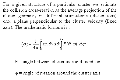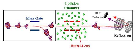 A particular ion (parent) is selected from the clusters’ size distribution using a mass-gate. Some energy is transferred to the cluster through collisions with Kr atoms in a collision chamber, leading to its fragmentation. Because of energy conservation, the fragments have lower kinetic energy than the parents and penetrate less deep into the reflectron and arrive earlier at the detector. Thus, they are separated from the parent masses in the TOF spectrum. The fragmentation cross-section which in this case is the lower limit of the integral collision cross-section is obtained. |