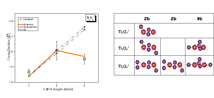 The experimental cross-sections (points) are normalized to the theoretical ones (lines), which are estimated with the geometric projection model using minimum energy structures of TixOy+ clusters calculated from different theoretical groups |