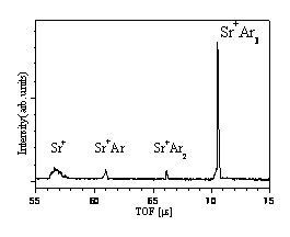 The TOF spectrum of the mass selected Sr+Ar3 cluster after the photofragmentation with a tunable OPO laser at ë=450 nm. |