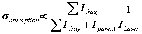 The study of metal-ion noble gas/molecule complexes aims to improve our understanding of the nature of interaction forces responsible for molecular bonding. The development of novel cluster ion sources based on laser ablation of metal targets, in combination with photofragmentation spectroscopy of mass selected ions, offers a direct way for studying the optical properties (absorption spectra) of an ionic complex of interest. The Technique From the size distribution of the clusters M+Xn (n=1 to tens, hundreds) produced from the ion source, a particular ion M+Xn is mass-selected with the mass-gate. After the mass-gate, a light beam from a tunable laser intersects the ion beam and causes photofragmentation. Because of the conservation of energy, the fragments have lower kinetic energy than the parents, penetrate less deep into the reflectron and arrive earlier at the detector being separated from the parent masses in the TOF spectrum. The photofragmentation spectrum is obtained by normalising the total intensity of ions by the intensity of the parent and the laser intensity ILaser at each different laser frequency. Assuming single photon absorption and that each absorbed photon leads at least to one evaporation event in the time window of measurement (~10ìsec), the photofragmentation cross section is equal or constitutes a lower limit for the photoabsorption cross section. |