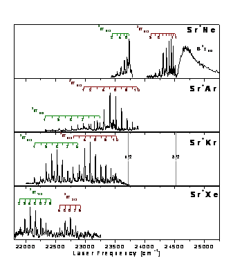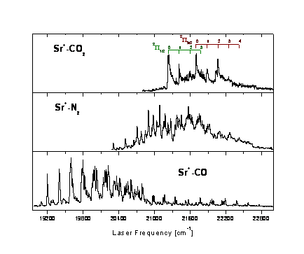The photofragmentation spectra of the size-selected Sr+X (X=Ne, Ar, Kr, Xe, CO2, N2, CO) complexes are measured over the 400 - 650 nm wavelength region1-7. In the most of the spectra, vibrational progressions are observed and are attributed to dipole transitions from vibrational levels v’’ of the electronic ground state X2Ó to vibrational levels v’ of the electronic excited states 2Ð or 2Ó. These excited states correlate to the Sr+ atomic states 52P or 42D. Isotope-resolved measurements of several of the observed transitions are performed to obtain the absolute vibrational numbering. From these assignments, the vibrational frequency ùe, the anharmonicity ùe÷e and the binding energy De of the involved states are deduced. The results are analyzed and compared in the framework of an electrostatic potential model. |